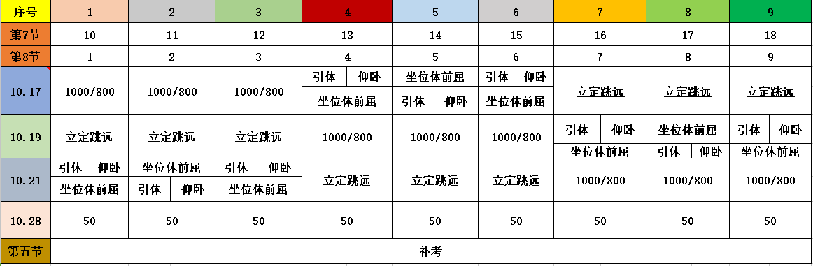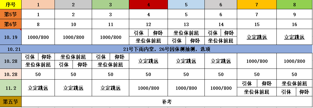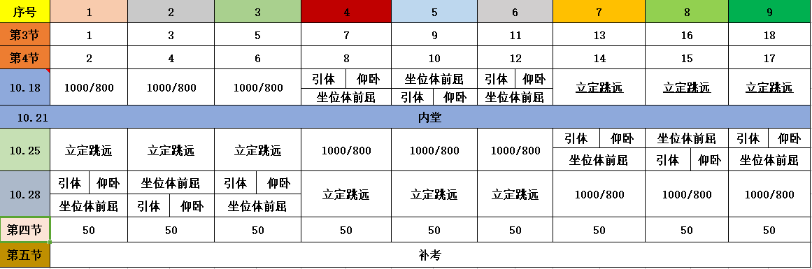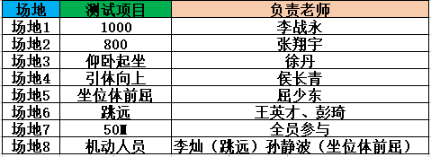 10月初期,利用两个课时完成了三个级部的选项课安排,从第三个课时开始,进行了2021年秋季学期的体质测试工作。因每节课出来的班级数量较多,我们对项目和场地进行了提前划分,采取场地负责教师不变,班级分批、分项目进行测试的方式,上课前学生先集中,场地负责老师将分配到的班级带领到测试场地。通过大家的齐心协力,顺利的完成了体质健康测试的测试工作。对因身体原因不能参加测试的同学统一组织补考或收取免测申请表和县级以上三甲医院的健康状况证明。具体时间安排及人员分工如下: